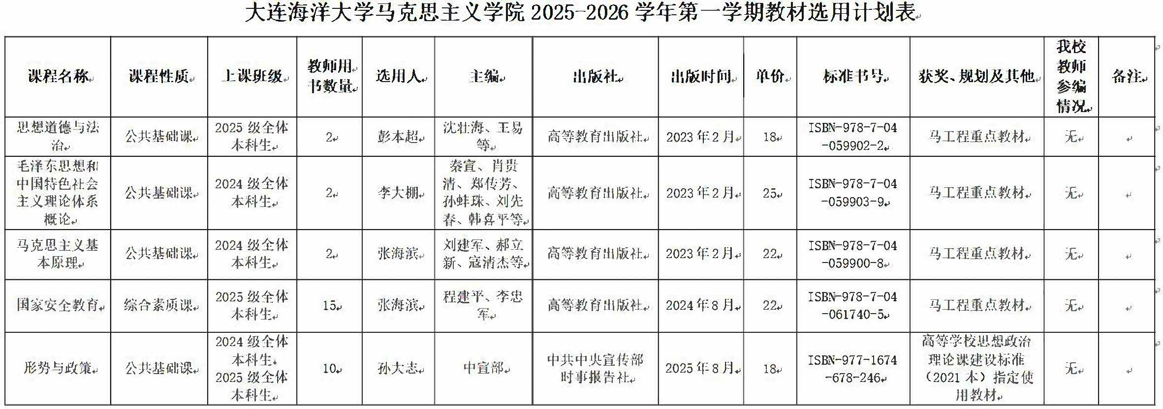 按照《关于落实2025-2026学年第一学期教材选用工作的通知》精神,学院组织开展了2025-2026学年第一学期教材选用工作。经各教研室提交教材选用计划、学院教材工作小组审议通过,现对学院2025-2026学年第一学期教材选用情况进行公示,公示时间为2025年7月13日-14日。在公示期内如有异议,可以电话、信函等方式实名反映,反映问题要实事求是。