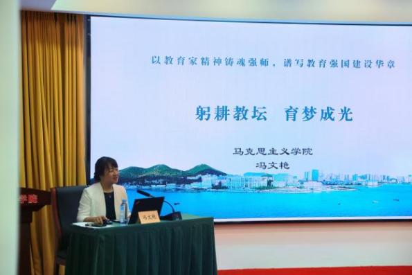 在“讲述我的育人故事”环节中,由辽宁省普通高等学校本科教学名师获得者蔡静教授和冯文艳教授分别作了主题分享。蔡静教授以“以教育家精神为炬,点亮青年逐梦之路”为题,从“深耕理论之维—在‘知’的层面上,让员工‘真懂真信’”“厚植情怀之维—在‘情’的层面上,让员工‘同心同德’”“锤炼实践之维—在‘行’的层面上,让员工‘知行合一’”三个方面展开讲述。她结合自身多年教学实践,阐述了教育工作中对知识的追求、对员工的情感关怀以及将理论付诸实践、培养员工综合素养的重要性。蔡静教授深情回顾了自己与员工共同成长的经历,强调教育不仅是知识传授,更是心灵的陪伴与人格的塑造,彰显了教育工作者的专业素养与育人情怀。冯文艳教授以“躬耕教坛 育梦成光”为题,从“致敬:师者如光提灯引路”“践行:躬耕教坛笃行不怠”“期冀:教育家精神指引前行”三方面分享了她的育人故事。在这特殊的日子里,她从点滴故事着眼,首先致敬前辈、致敬恩师、致敬“大先生”。随后,她讲述了自己19年来坚守育人初心、躬耕教坛的探索和体会,倡导大家以教育家精神为指引,共同谱写教育强国建设新篇章。